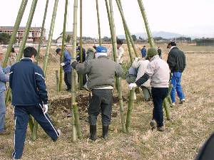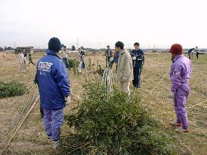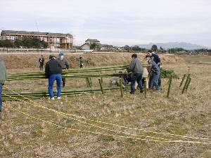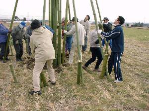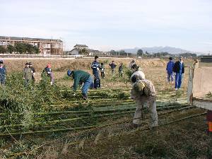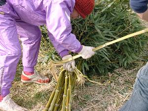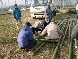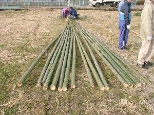 ![]() 3 小屋の柱にする竹16本の長さをそろえる。 |