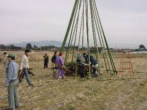 ![]() 5 小屋を建てる場所を決める。縄を使って円を書く |