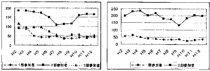 | 1.はじめに 近年、少子化・子供たちのクラブ活動離れ・競技者の低年齢化・専門化・高度化等々の理由により各競技の部員数が急激に減少しています。体操競技においてもその傾向は顕著であり、平成2年から平成10年の9年間に全国の部員数がほぼ半減しており、体操部が廃部となった学校も多数あるようです。 その原因となるものは冒頭に述べた理由以外にも、中学・高等学校の教員の高年齢化、転勤による体操経験を有する指導者の不在や施設・用具の問題、(近年特に器具の規格変更が多いが学校予算では対応できない)、体操競技特有の事故等危険性の問題などいろいろ考えられます。大阪府においても部員数の減少傾向は止められない状態にありますが、今日まで高体連体操部に携わってこられた諸先輩方が、競技会の運営面において様々な工夫をすることにより、出来るだけたくさんの高校生が安全に体操競技に親しみ、楽しめるように努力されてこられました。今年のインターハイでは男子が団体優勝・女子が準優勝と素晴らしい成績をあげました。 大阪においてはこのようにトップ選手も活躍していますが、反対に高校から体操を始めた選手も数多くがんばっています。ここで、大阪高体連体操部の今日までの取り組みが他の府県体操部や他の種目にとって参考になればと思い発表させて頂きます。 2.大阪高体連の取り組み (1)2部規定の導入 1973年(昭和48年)以前は、すべて全国高体連規定を採用し、上位8校(女子は6校)・個人15位までを1部、それ以下の学校を2部校とし、1部には近畿・全国大会予選の出場資格を与えていました。1974年(昭和49年)体操競技の技術の進歩により全国高体連規定が年々高度な技を要求されるようになり、高等学校から体操を始める殆どの者にとっては非常に危険で難しくなってきました。そこで全国高体連規定から、難度の高い技や危険性の高い技を除き基本技を中心とした2部規定(大阪高体連規定)を作成しました。1部規定(全国高体連規定)と2部規定は学校及び個人が任意で選択することが出来る。ただし、近畿・全国大会予選は1部規定を採用する。その結果、選手たちは自分の能力に応じた大会を選択することにより、無理なく安全に競技に参加できるようになり、高校から体操競技を始めた者にとっても勝負のおもしろさが味わえるようになり、指導者も安心で尚かつ、目標を持たせられるようになった。 (2)オープン競技の導入 1982年(昭和57年)男子にオープン競技として、マット(パランスー倒立前転一前転とび)と跳馬(横向き120cm‐マットをかける・前転とび)だけの競技を取り入れた。参加者は各校無制限で1種目での参加も可とした。服装は短パン・Tシャツでも可とし学校体育の服装も可とした。これは、体操を始めた1年生から試合経験をさせよう、また体育の授業で少しマットや跳び箱の得意な生徒を体操競技に参加させようということが目的であった。 (3)3部規定の導入 1989年(平成元年)オープン競技を発展させた形で2部規定より更に簡単な3部規定を作り3部の試合を行うようになった。男子は、床・鞍馬・跳馬・鉄棒の4種目で、個人各校6名以内で個人総合と種目別を競う。1種目での参加も可とし服装もオーブン競技と同様にした。これは、オープン競技からより体操競技に近づけることをねらいとした。なお吊り輪・平行棒に関しては、器具のない学校もあり(鞍馬・跳馬は跳び箱で代用する事が出来る)、専門の指導者の不在や、生徒にとっても困難であると判断し3部規定より除いた。当時生徒増により、新設高校が数多く設立されたが、設備・器具の完備されていない学校や、専門の指導者のいない学校が多くあったが、この規定を導入することで競技に参加しやすくなった。その結果体操人口は大幅に増加した。 1992年以降は1校1種目4名以内に制限するほどとなった。 女子においても男子と同様な考えから同年3部規定を作成し、1校1チーム4名以内で団体・個人総合・種目別を競うようにしたが、男子ほど効果が無く2部規定で出来ない技を抜くことで十分参加できることや、2部の参加者が多いこともあり1992年に廃止した。 (4)オールラウンド制の廃止とユニフォームの規制緩和 1995年(平成7年)より2部大会においてオールラウンド制を廃止した。1校4人出場−ベスト3での団体戦に対し、1種目4人まで選手を各種目によって変えても構わないことにした。つまり、極端な場合は最大限男子4人×6種目=24人、女子は4人×4種目=16人が出場できるようにした。あわせて多数の選手が出場するにあたりユニフォームの統一が困難となったので規制も緩和しチーム内で不統一であっても可とした。このことにより多くの選手が出場できるようになった。また選手にとっては苦手な種目に出場しなくても良くなった。3年間の経過より、活性化が図られると判断して平成10年より全大会において2部の試合でオールラウンド制を廃止した。次のグラフは、大阪高体連・春季大会参加者数の推移である。年々参