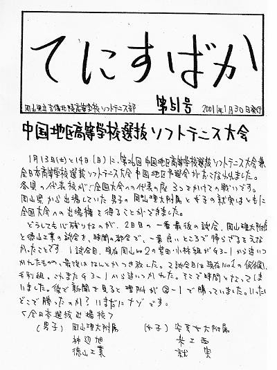![]() 本日「てにすばか」が届きました。これは岡山県吉備北陵高校大池先生が出しているソフトテニス部通信の総集編です。早速1号から読み始めましたがおおいけ先生の情熱に圧倒されました。山間部の小さな高校で、少ない部員と大きな夢を持って、たとえ勝てなくともあくまでも明るく、前を向いて、ソフトテニスをとことん愛し、生徒と一緒に泣いたり笑ったり、「学校の先生になって本当に良かった。」と叫んでいます。 平成11年6月28日に第1号、そして13年1月31日に51号と1年半の北陵高校ソフトテニス部と岡山県高体連ソフトテニスの歴史が手に取るようにわかりました。 おおいけ先生有り難うございました。ホームページと両方は大変でしょうが、100号を目指して頑張ってください。 ご来場の皆様、吉備北陵高校ソフトテニス部の応援よろしくお願いします。URLはhttp://ww9.tiki.ne.jp/~ooike/index.htmです。 |